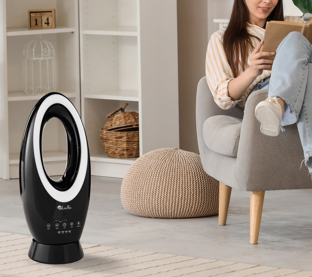 The LivePure Bladeless Rechargeable Indoor/Outdoor Air Purifying Fan will keep you cool and comfortable wherever you are, indoors or out. Beat the heat with this portable cooling option with its water-resistant design. Powered by an AC Adapter and built-in lithium battery, you'll have the cool air you need with a continuous run time of up to 19 hours of battery.
